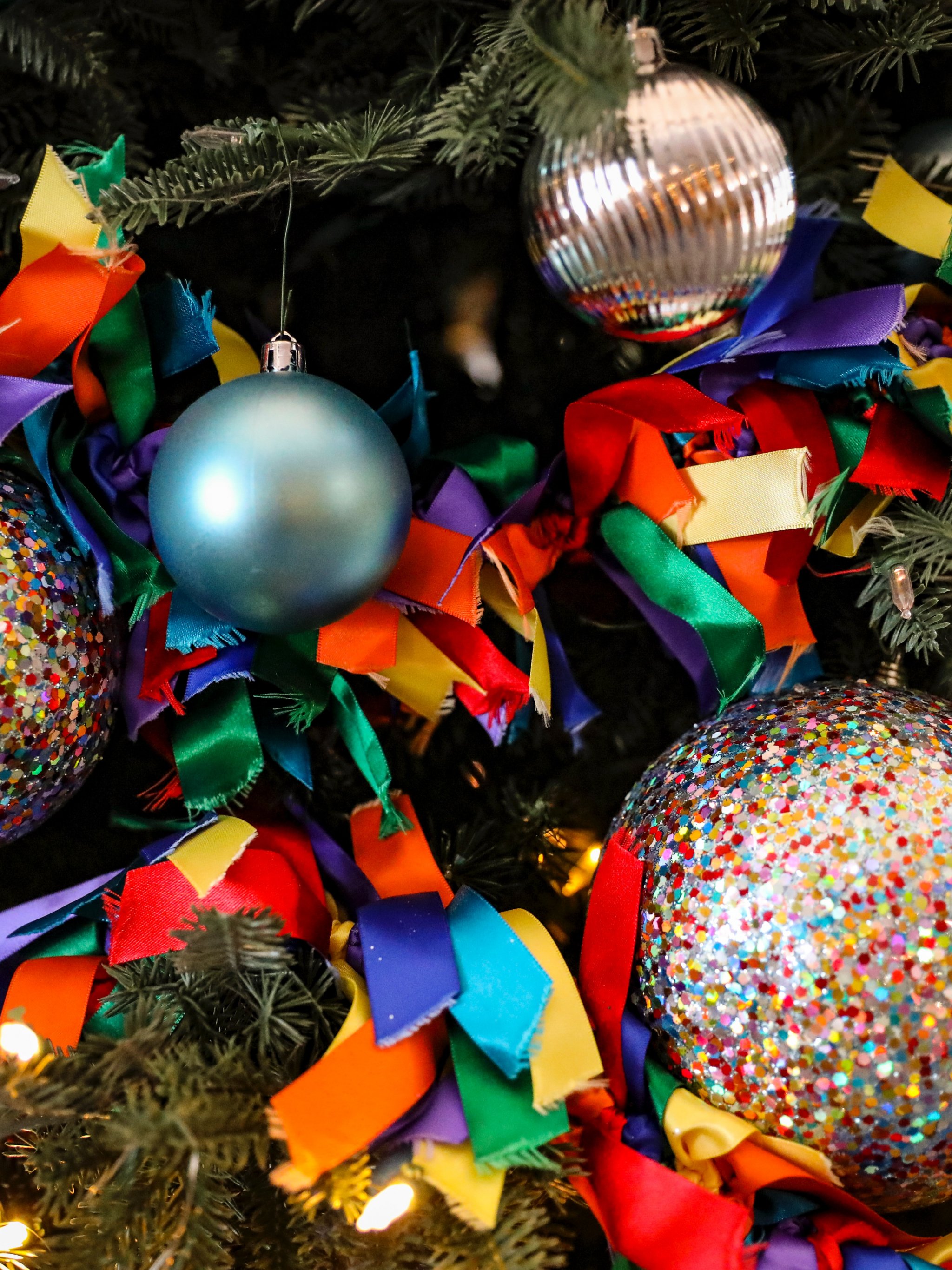 Обои: елочные игрушки, конфетти, ярко, праздник, Новый год - 2048x2732