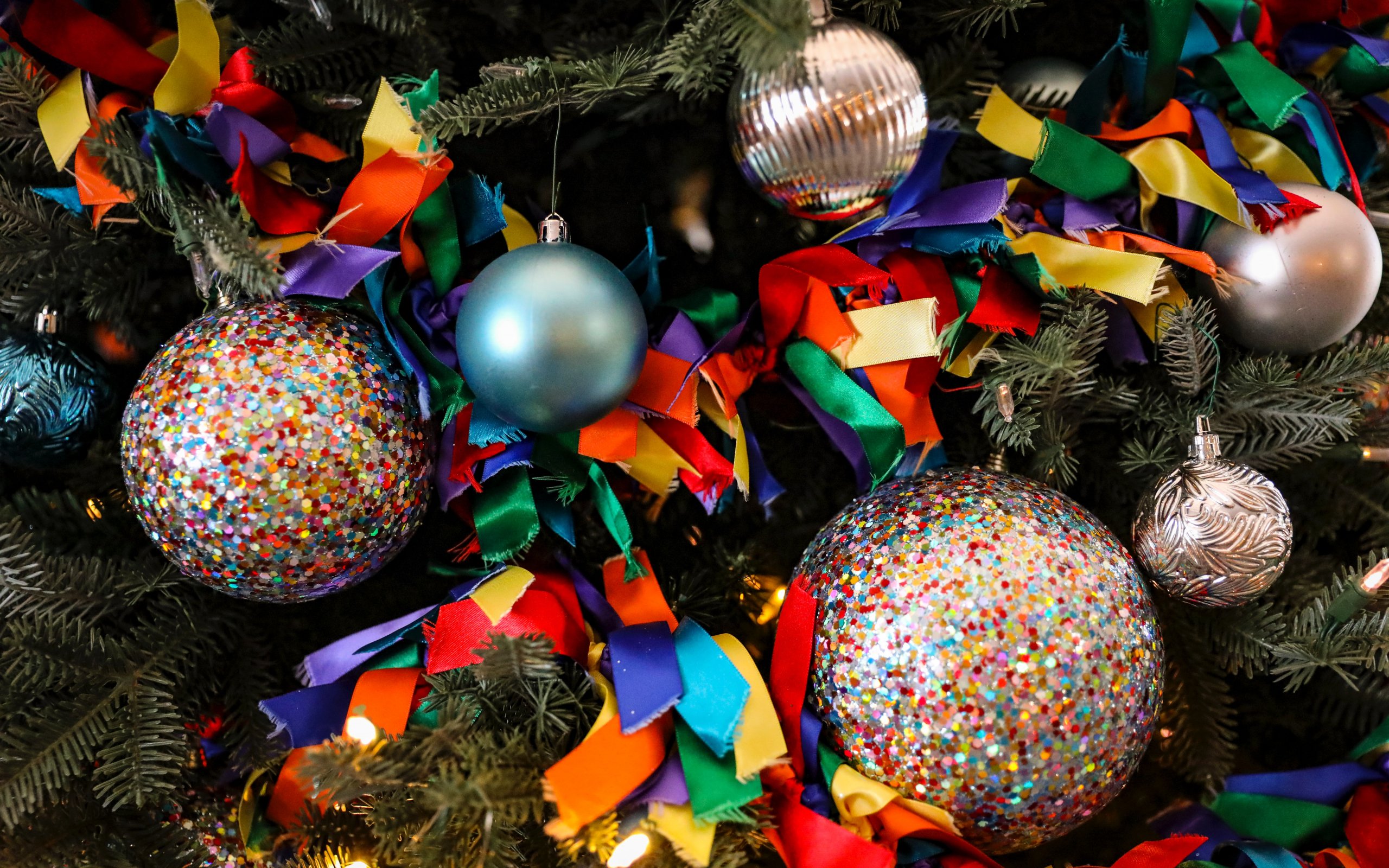 Обои: елочные игрушки, конфетти, ярко, праздник, Новый год - 2560x1600