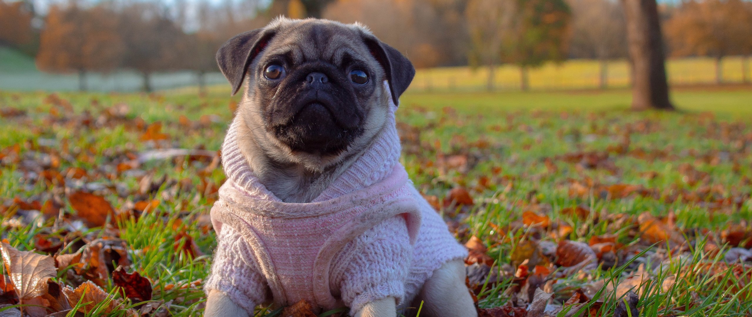 Обои: мопс, осень - 2560x1080