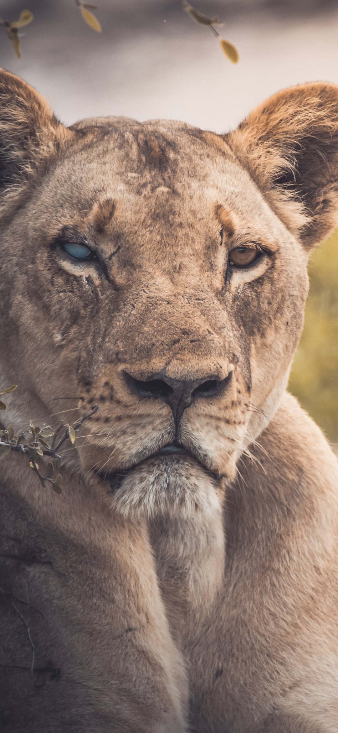 Обои: львица, взгляд, шрам - 1080x2340