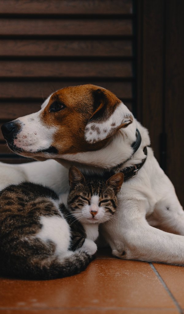 Обои: дружба, кот, собака - 600x1024