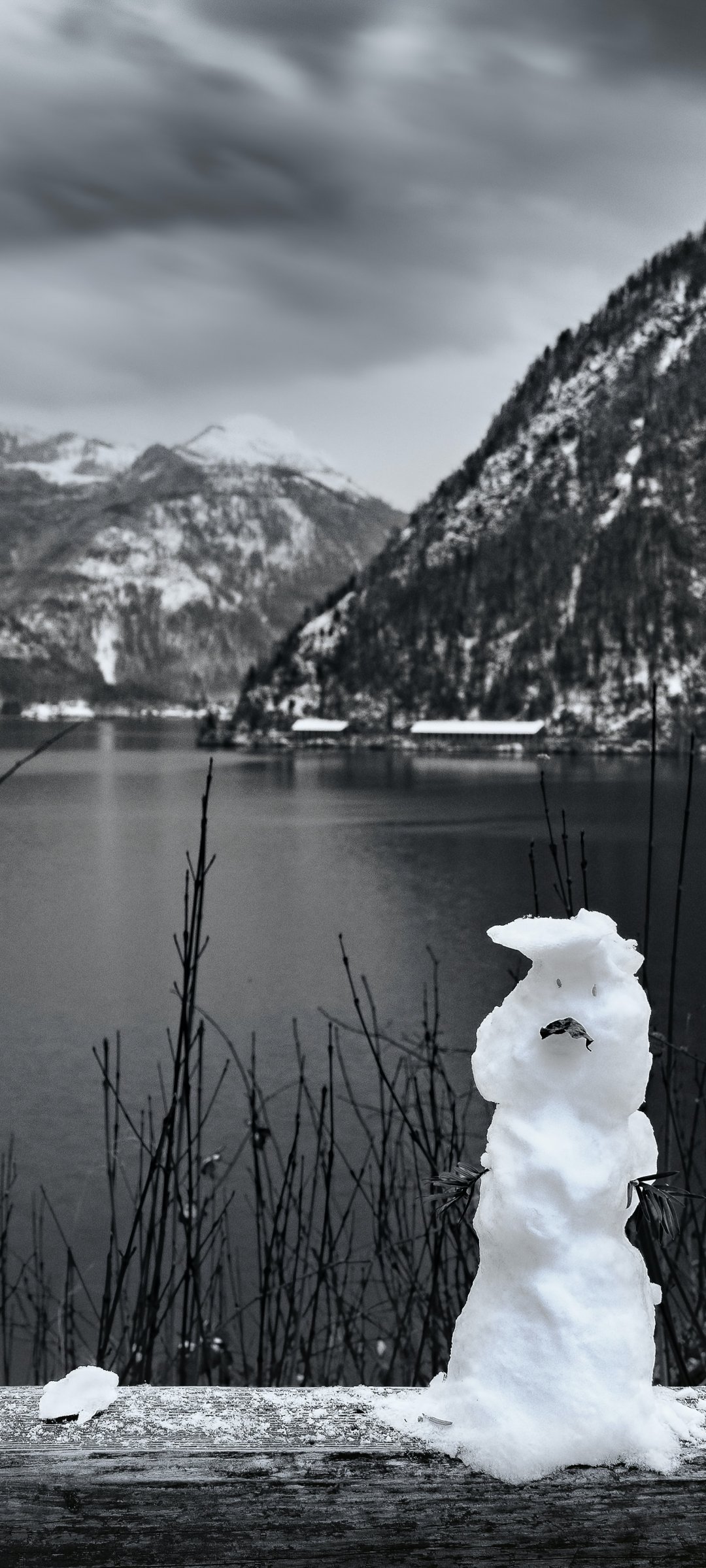 Обои: горы, озеро, снеговик - 1080x2400