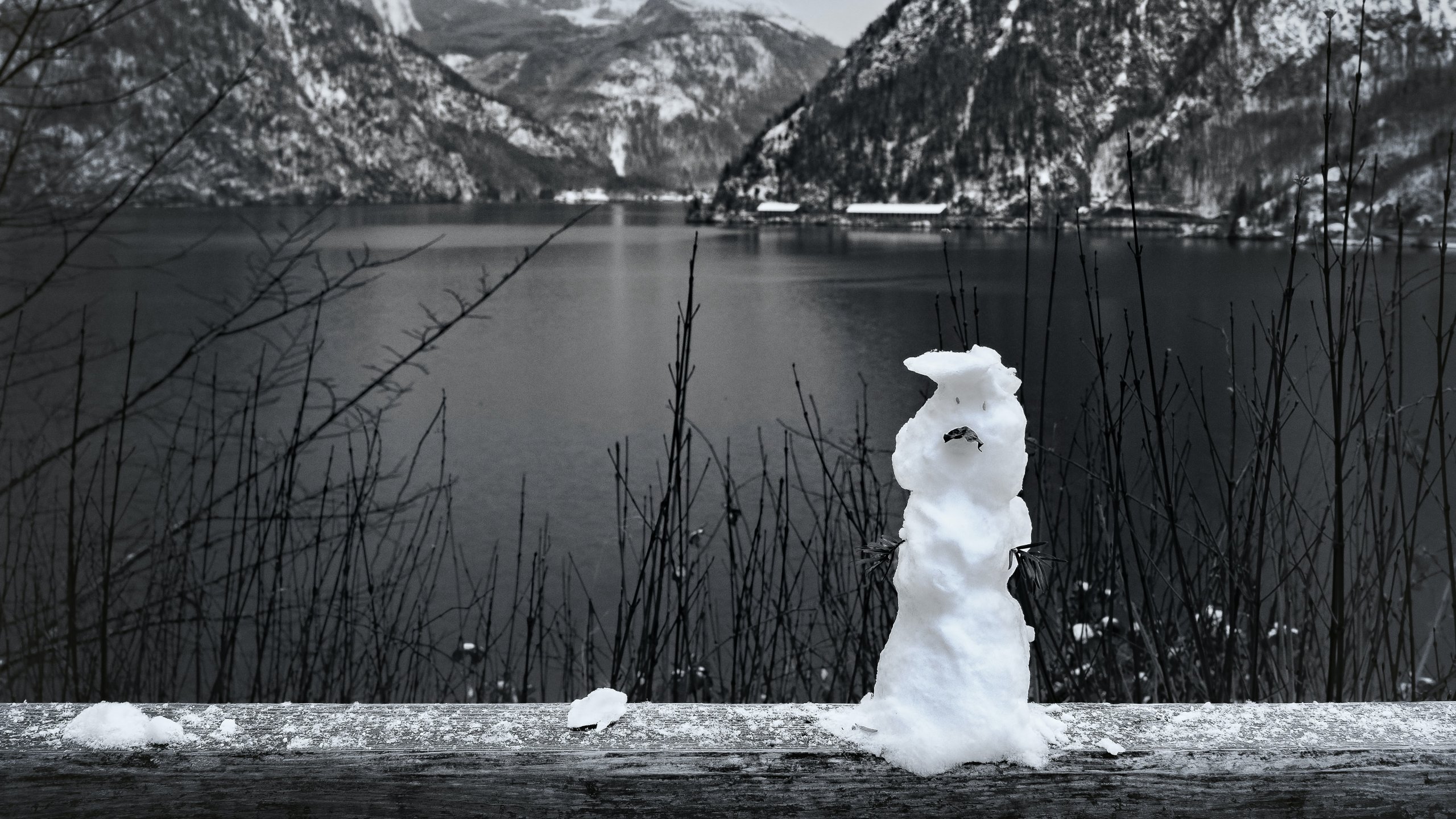 Обои: горы, озеро, снеговик - 2560x1440