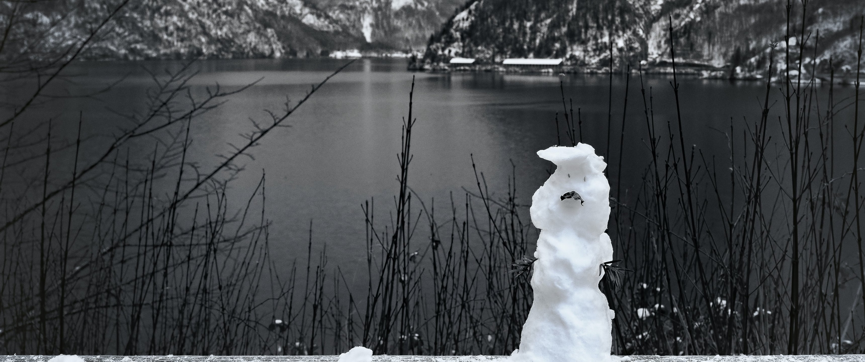 Обои: горы, озеро, снеговик - 3440x1440