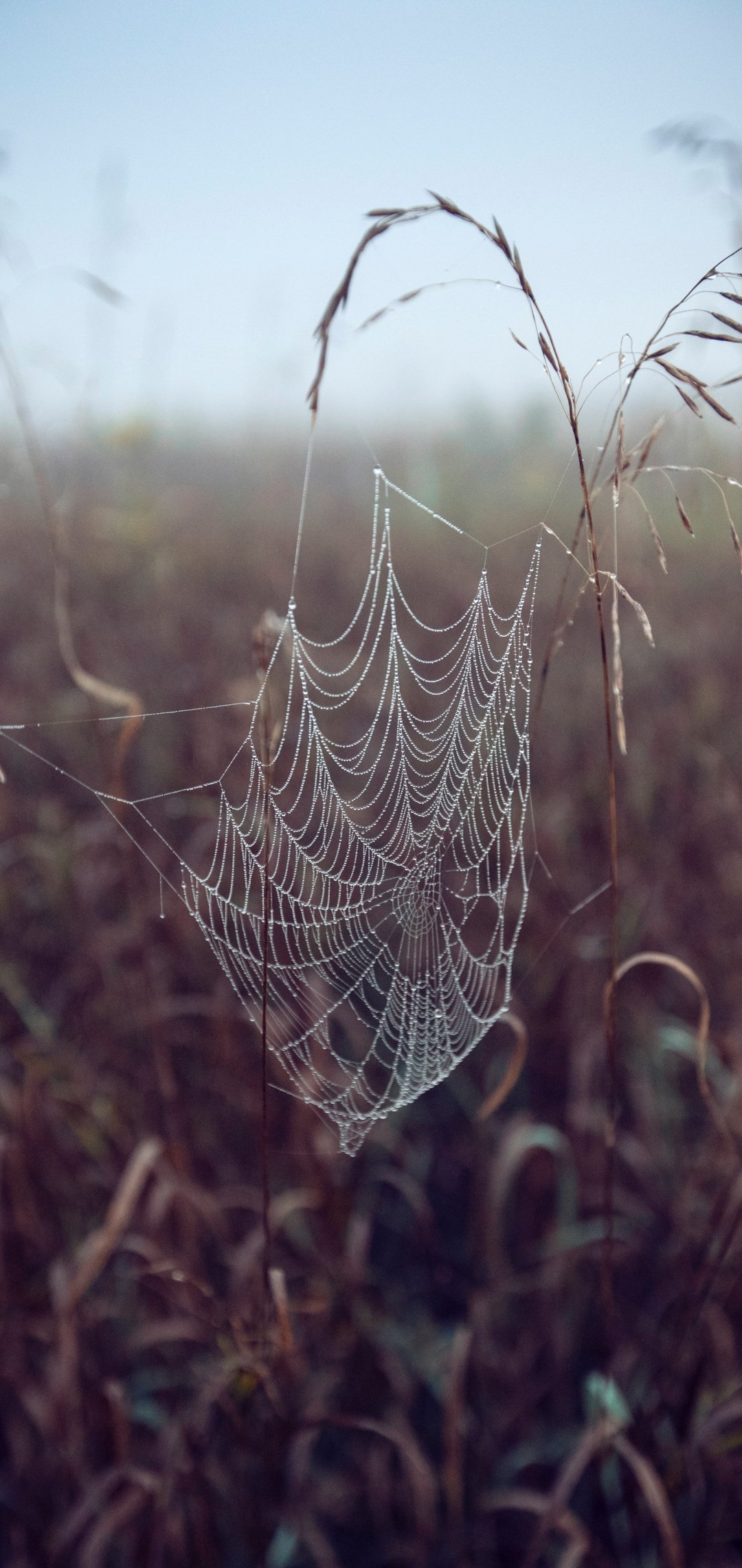 Обои: паутина, поле, утро, роса - 1080x2280