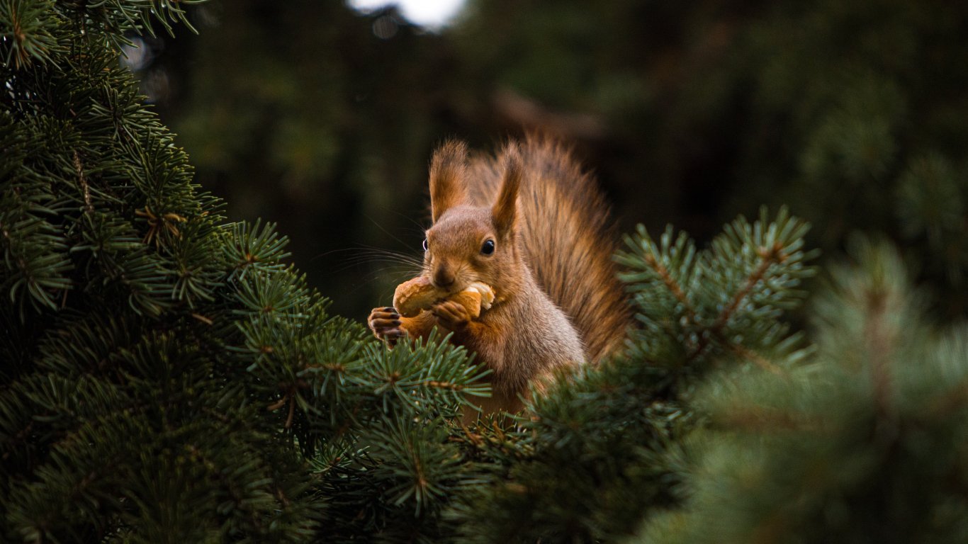 Обои: белка, рыжий, ель - 1366x768