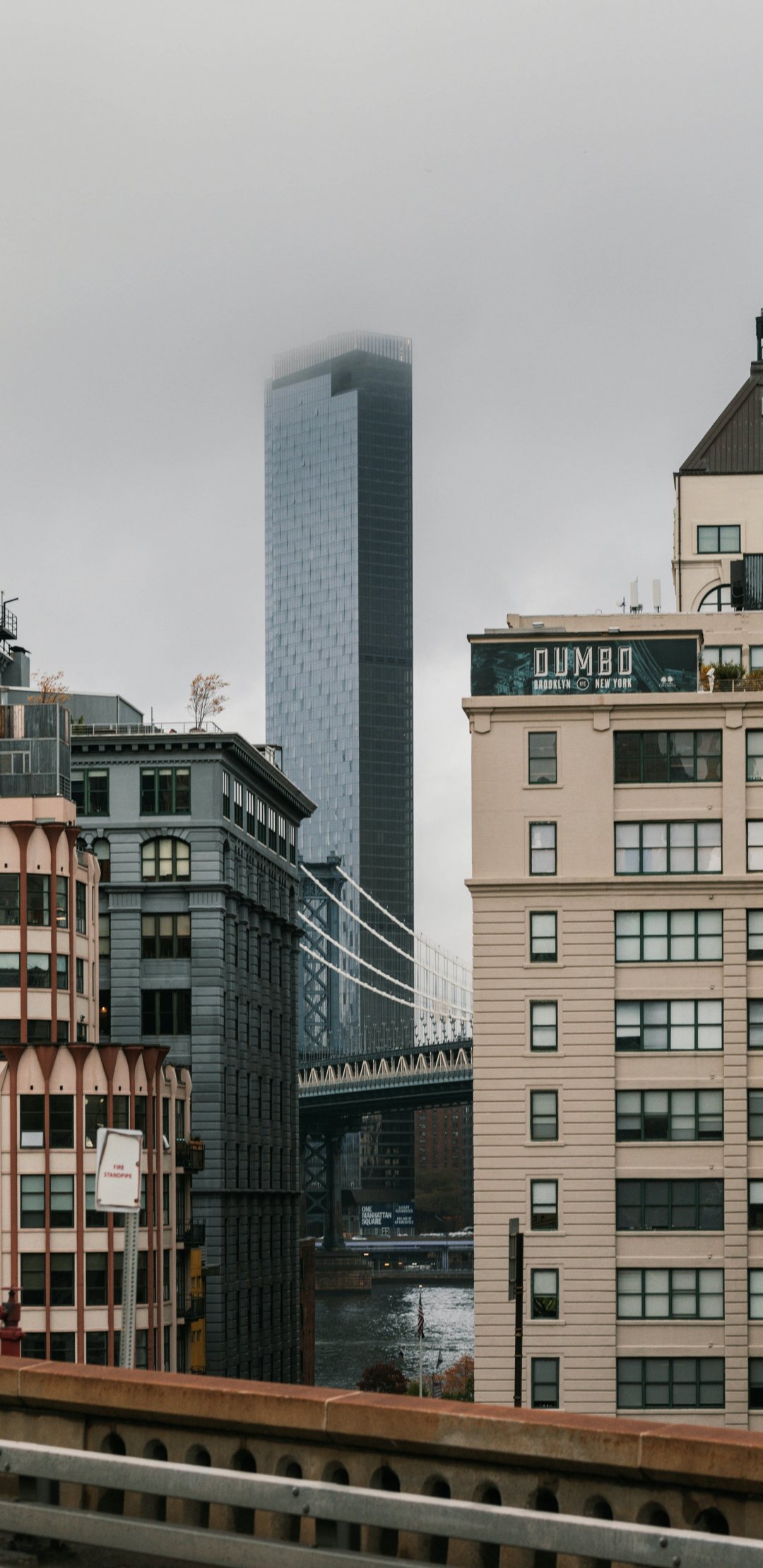 Обои: Дамбо, Бруклин, Нью-Йорк, США Дамбо Бруклин новый Соединенные Штаты Америки уличная фотография Дамбо Бруклин туманный недвижимость описание мост дамбо туман архитектурный Манхэттенский мост небоскреб город - 1080x2220