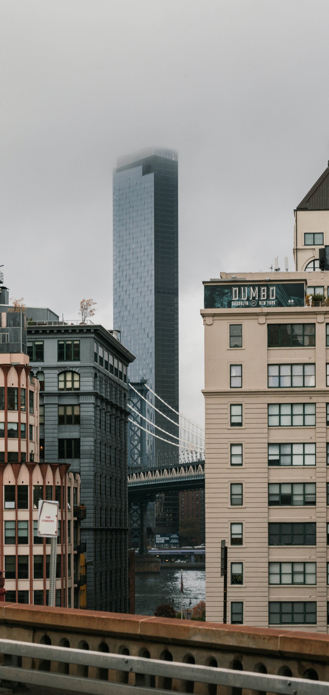 Обои: Дамбо, Бруклин, Нью-Йорк, США Дамбо Бруклин новый Соединенные Штаты Америки уличная фотография Дамбо Бруклин туманный недвижимость описание мост дамбо туман архитектурный Манхэттенский мост небоскреб город - 1080x2280