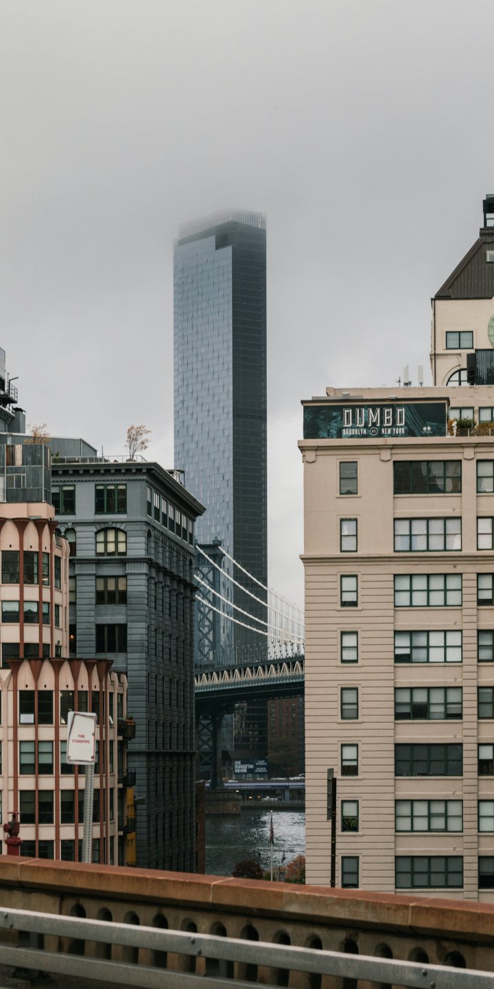 Обои: Дамбо, Бруклин, Нью-Йорк, США Дамбо Бруклин новый Соединенные Штаты Америки уличная фотография Дамбо Бруклин туманный недвижимость описание мост дамбо туман архитектурный Манхэттенский мост небоскреб город - 720x1440