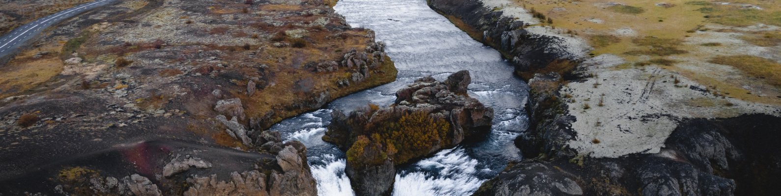 Обои: река, водопад, дорога, вид с дрона - 1590x400