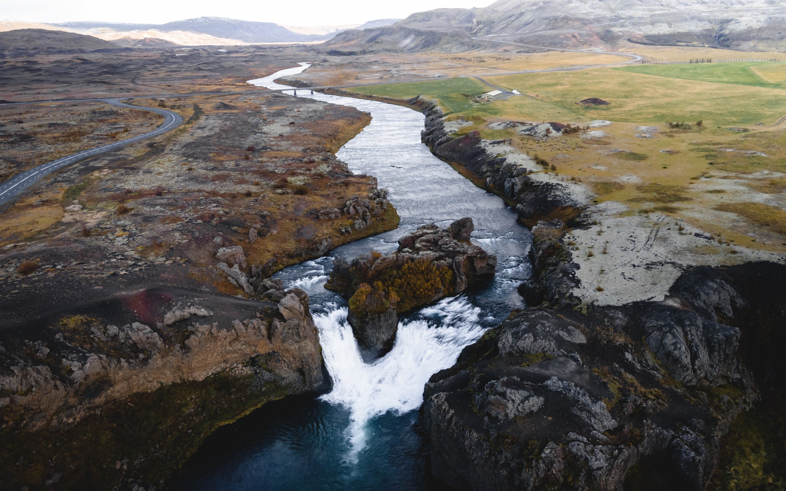 Обои: река, водопад, дорога, вид с дрона - 2560x1600