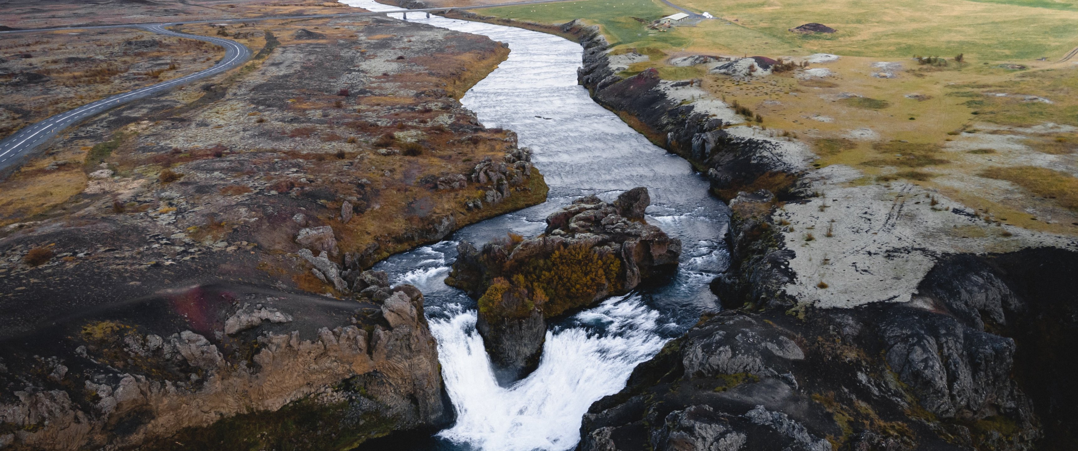 Обои: река, водопад, дорога, вид с дрона - 3440x1440