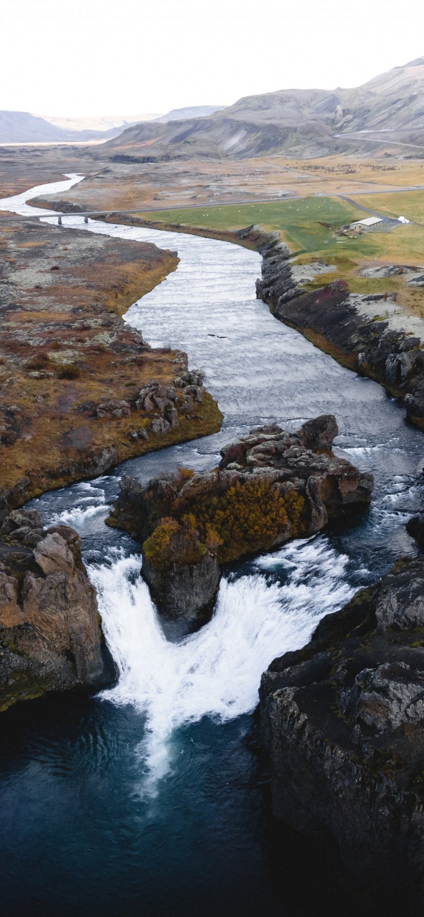 Обои: река, водопад, дорога, вид с дрона - 828x1792