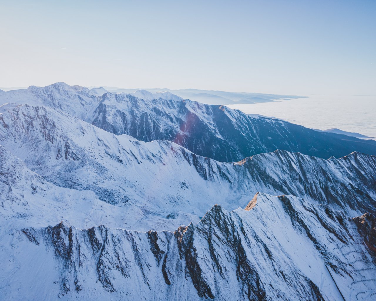 Обои: снег в горах, горы, зима, вид с дрона - 1280x1024