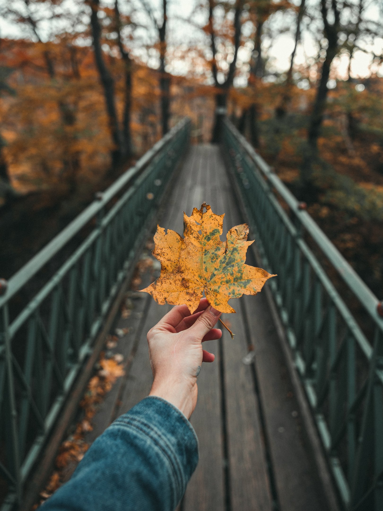 Обои: осенний лист, клен, мост, осень, лес - 1620x2160