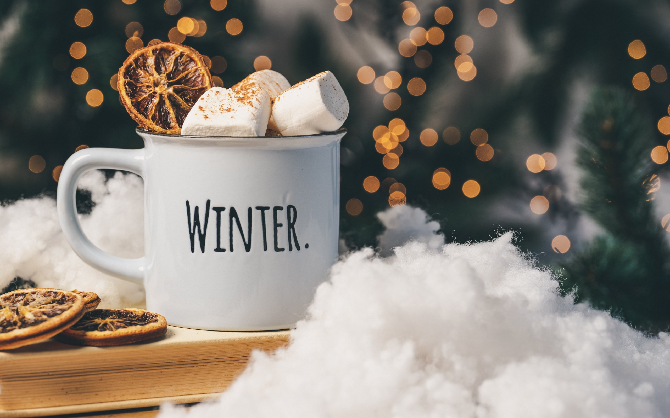 Обои: зима, зефир, кружка, какао, корица, огоньки - 2560x1600