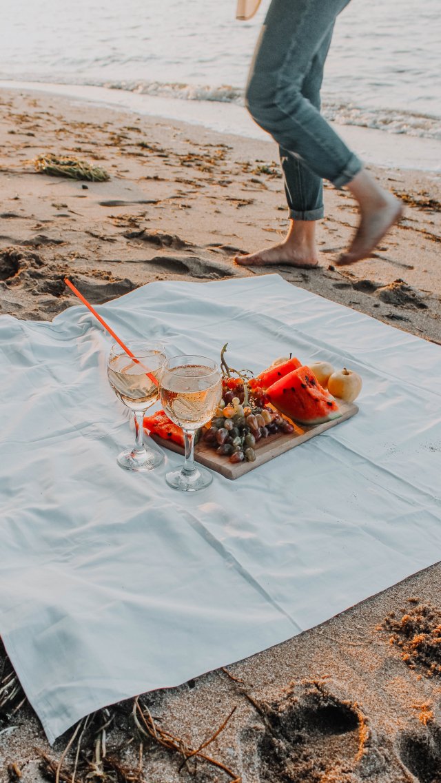 Обои: пикник, игристое, пляж, песок, романтика - 640x1136