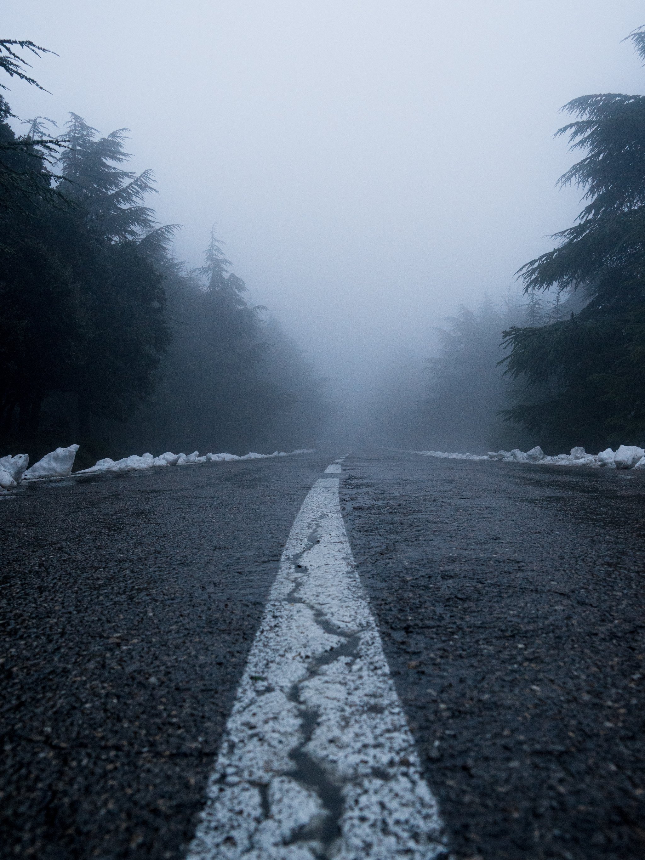 Обои: дорога, туман, лес, снег - 2048x2732