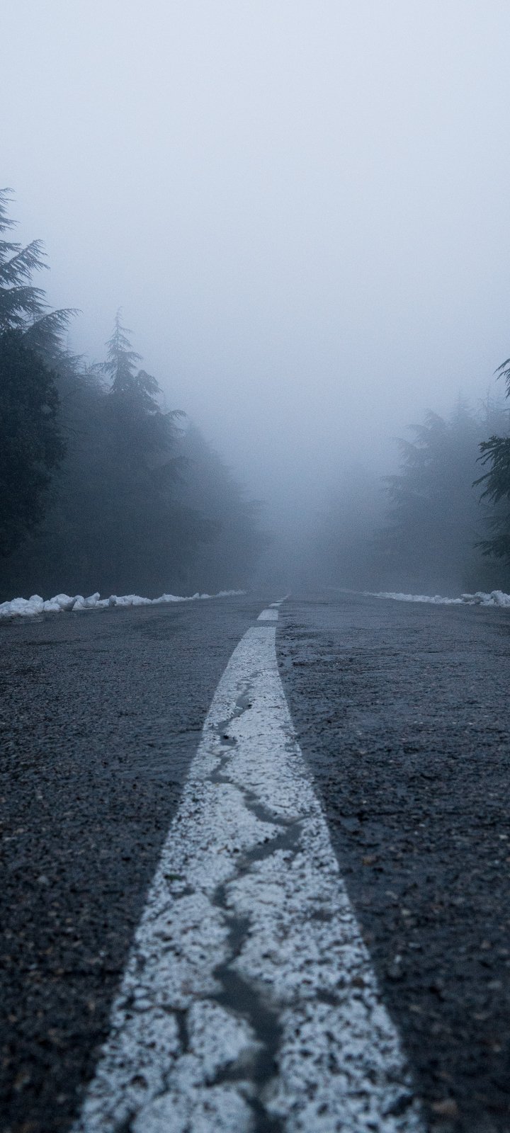 Обои: дорога, туман, лес, снег - 720x1600