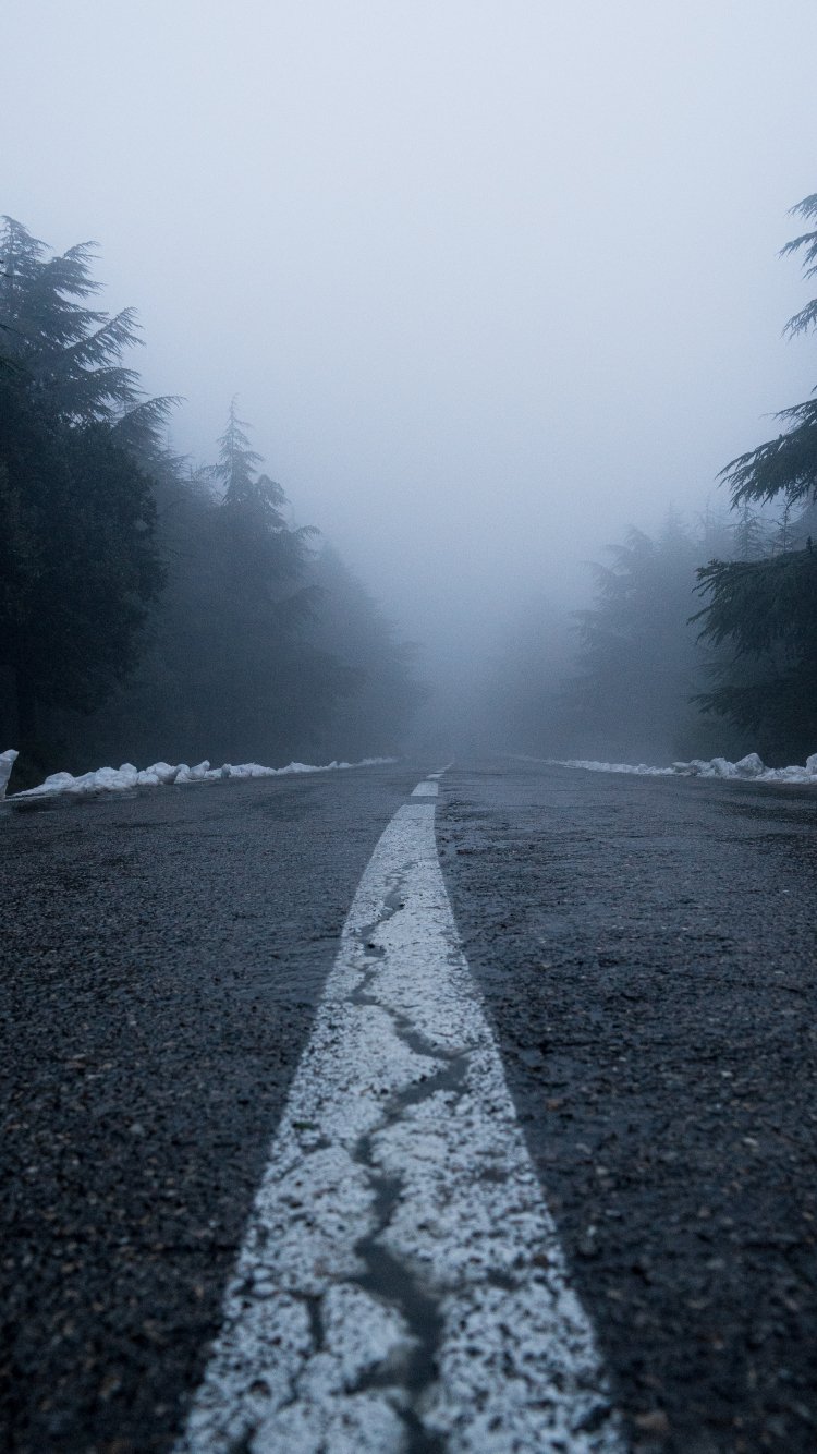 Обои: дорога, туман, лес, снег - 750x1334