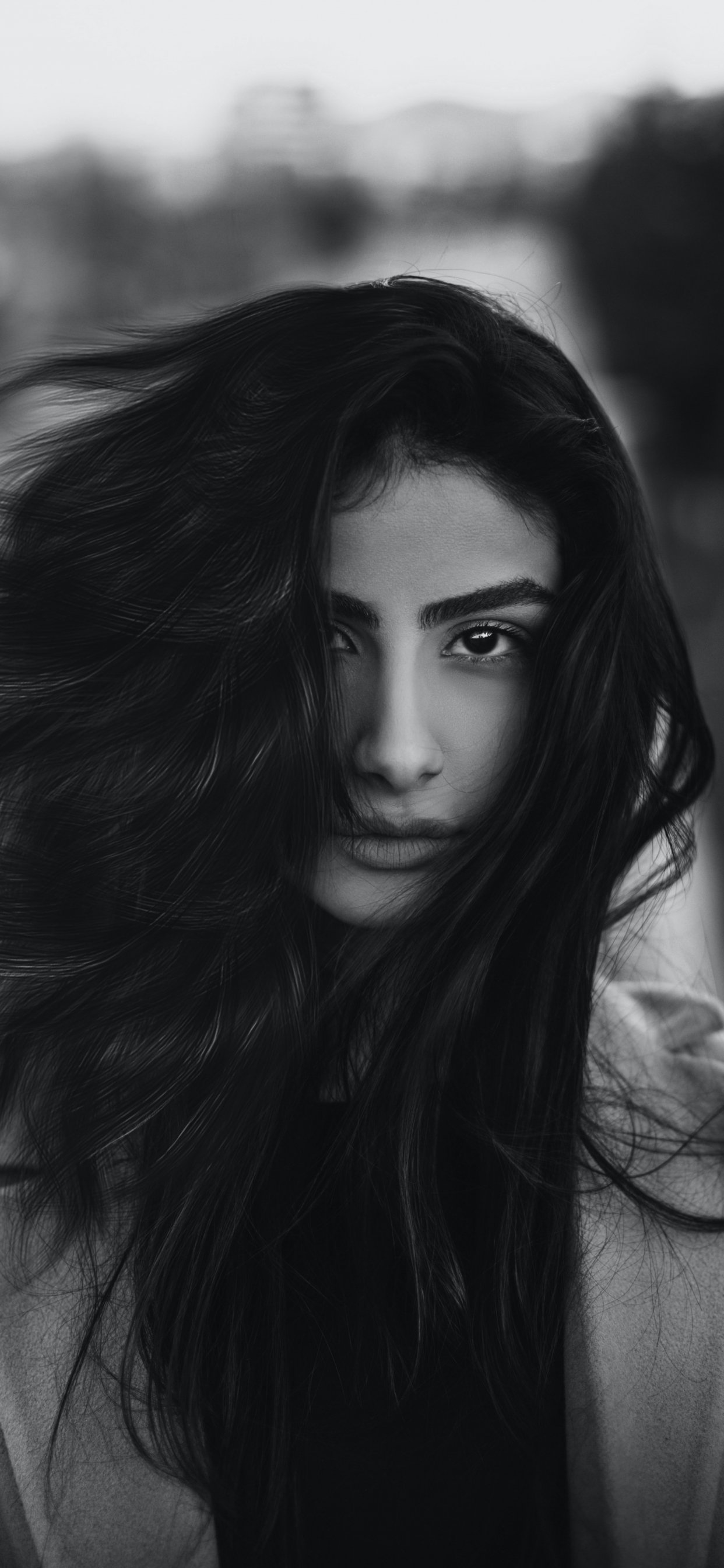 Обои: девушка, портрет, черно-белое фото, ветер - 1242x2688