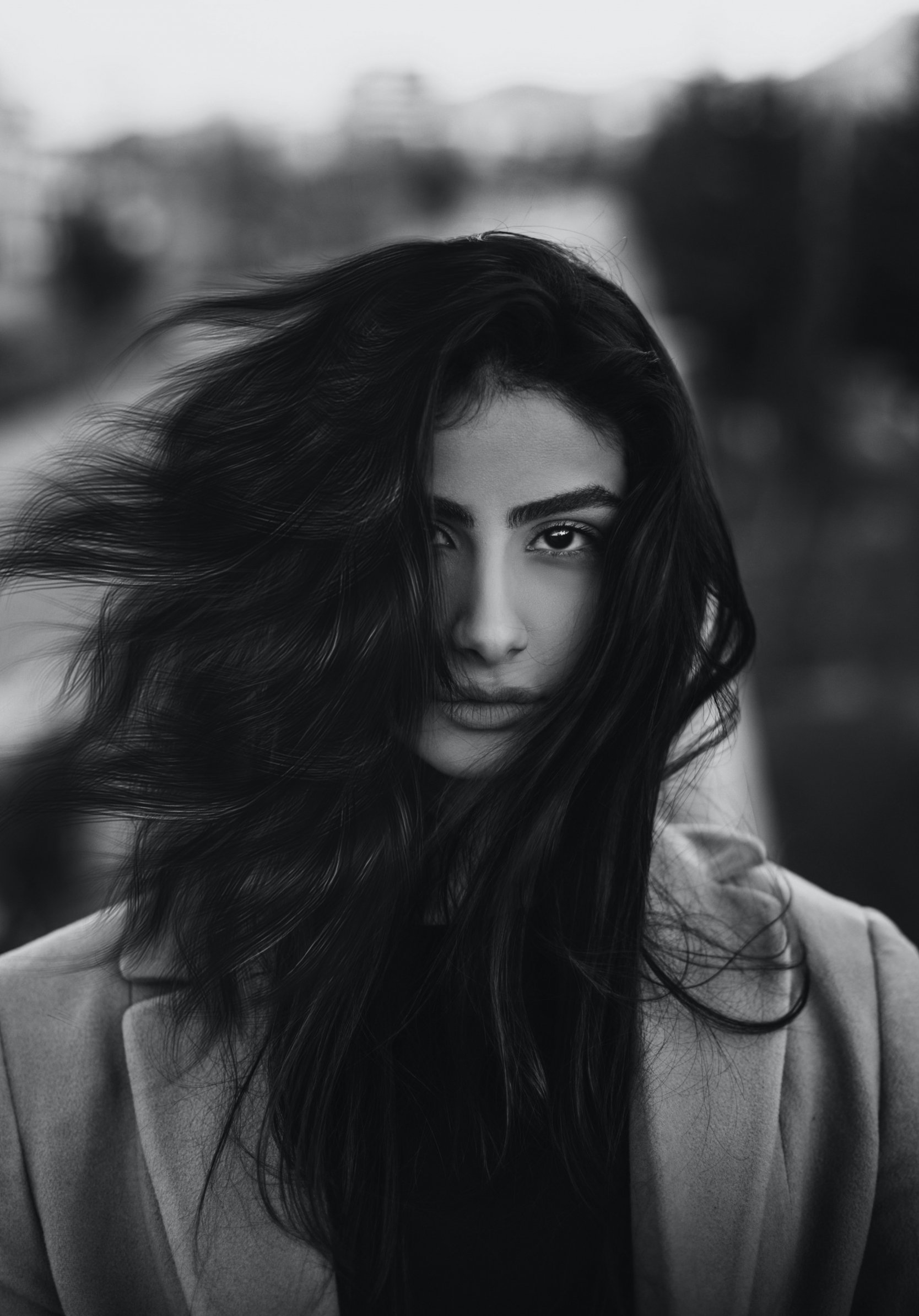 Обои: девушка, портрет, черно-белое фото, ветер - 1668x2388