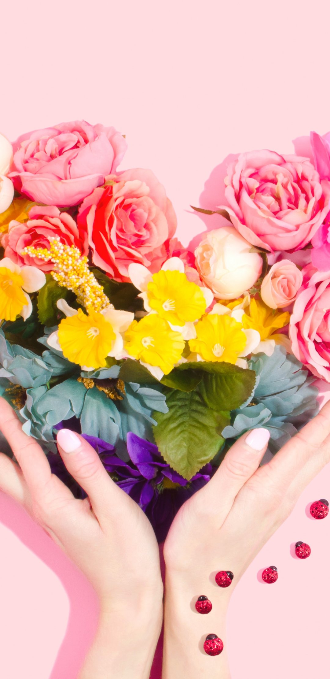 Обои: цветы, руки, сердце, розовый фон - 1080x2220