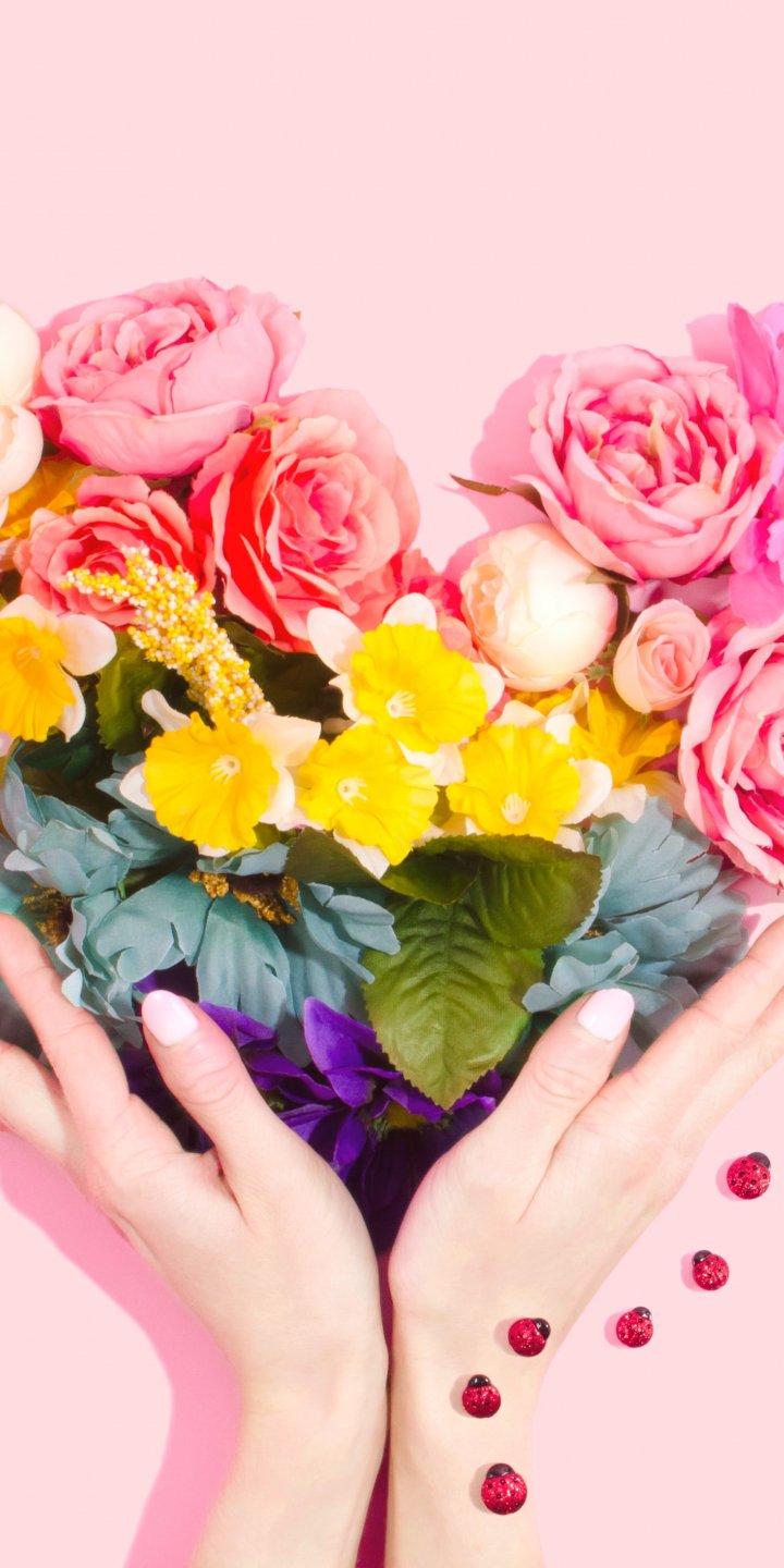 Обои: цветы, руки, сердце, розовый фон - 720x1440