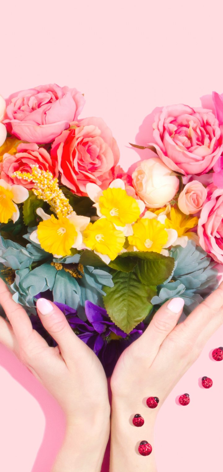Обои: цветы, руки, сердце, розовый фон - 720x1520