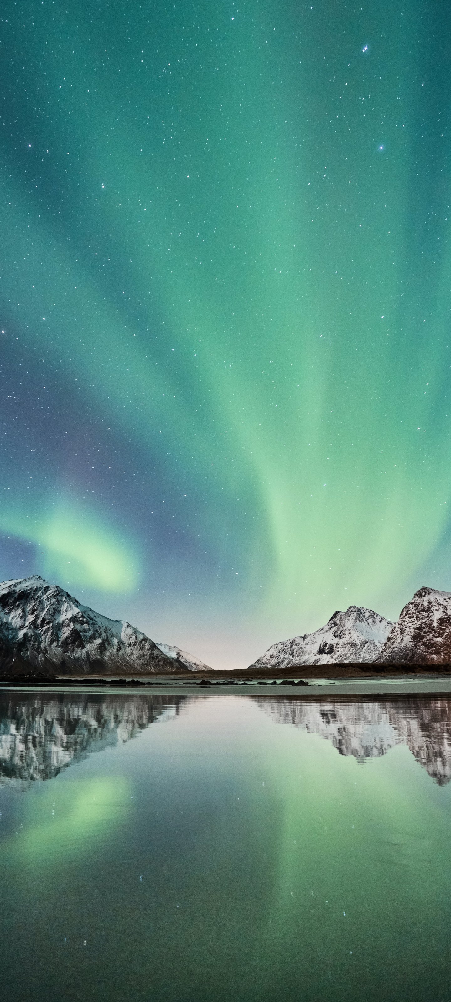 Обои: северное сияние, горы, озеро - 1440x3200