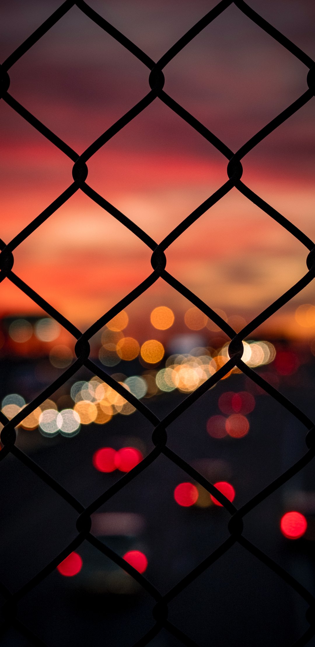Обои: решетка, закат, огни города - 1080x2220