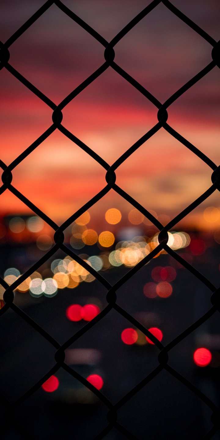 Обои: решетка, закат, огни города - 720x1440