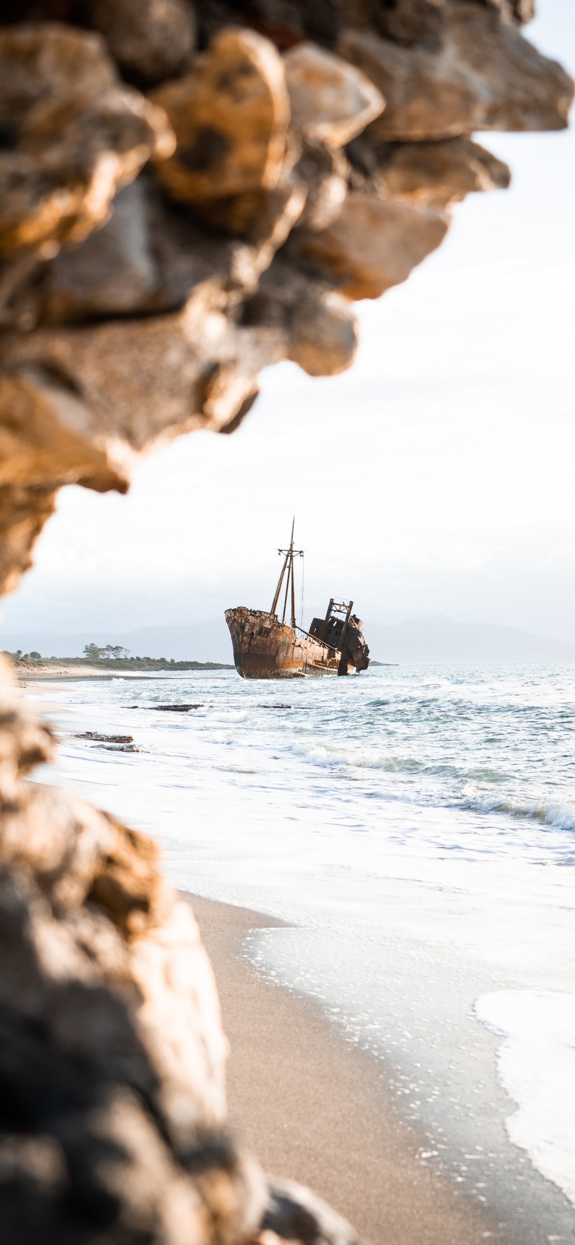 Обои: корабль, море, скалы, берег - 1170x2532