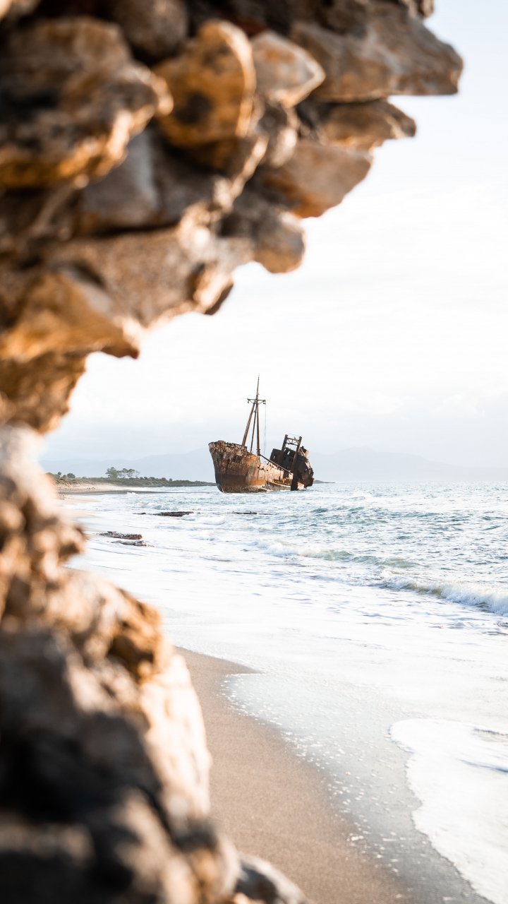 Обои: корабль, море, скалы, берег - 720x1280