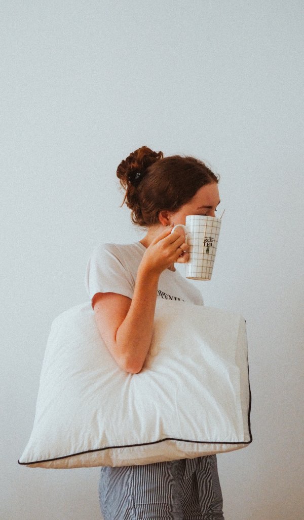 Обои: девушка, подушка, кружка - 600x1024