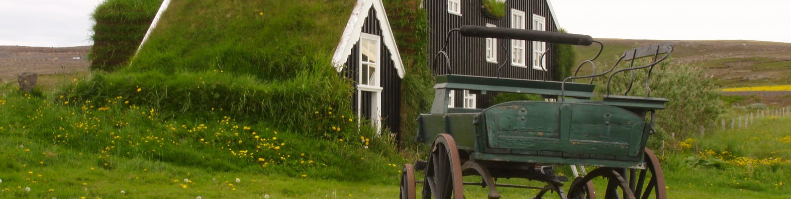 Обои: Исландия, зеленый, дом, телега - 1590x400