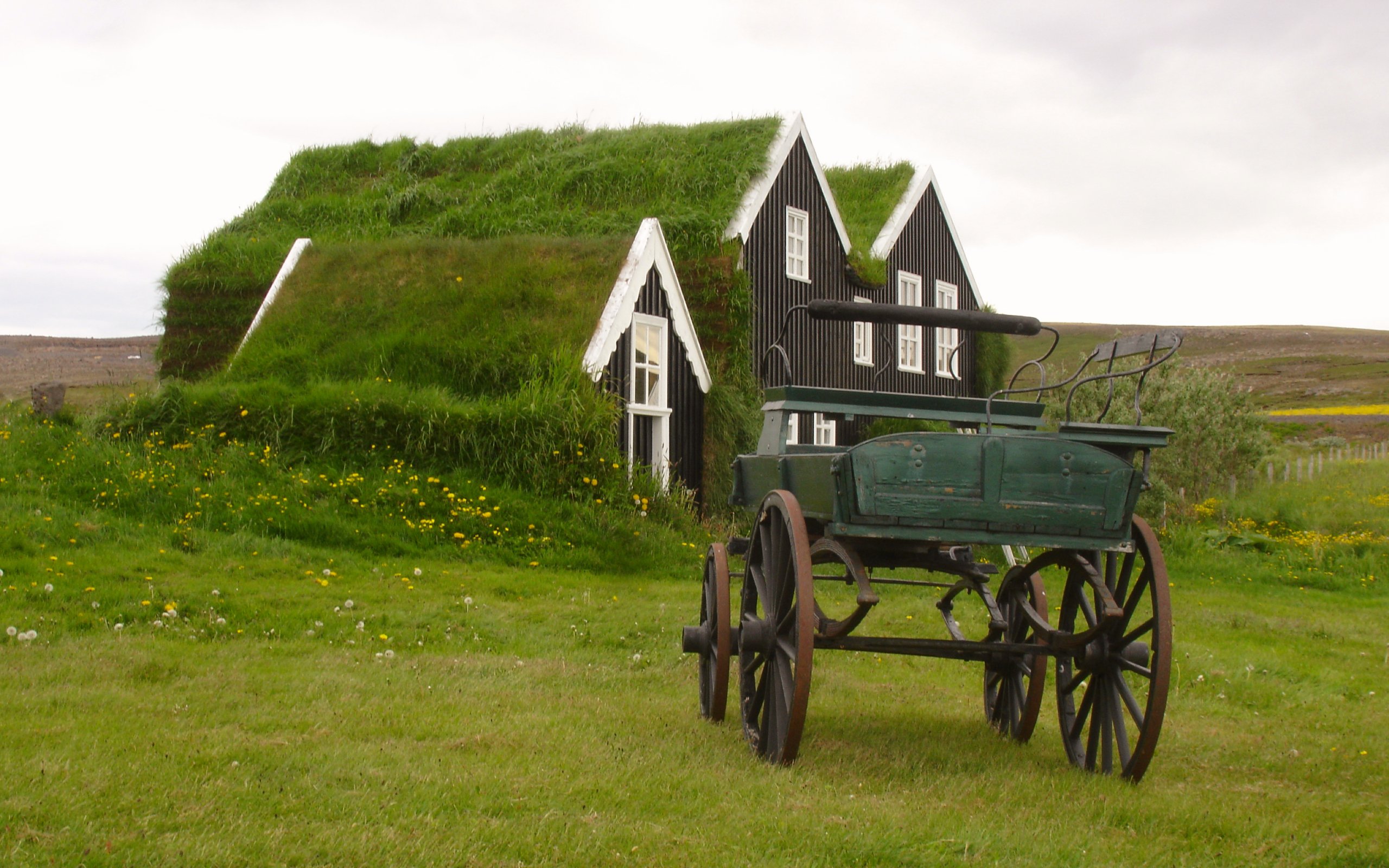 Обои: Исландия, зеленый, дом, телега - 2560x1600