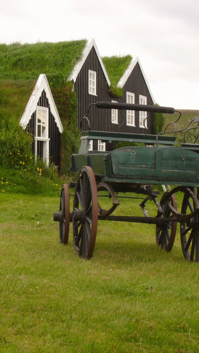 Обои: Исландия, зеленый, дом, телега - 640x1136