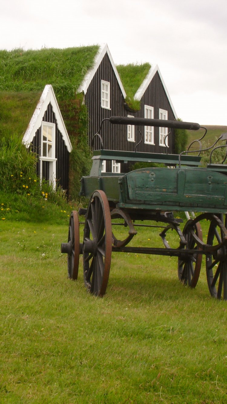 Обои: Исландия, зеленый, дом, телега - 750x1334