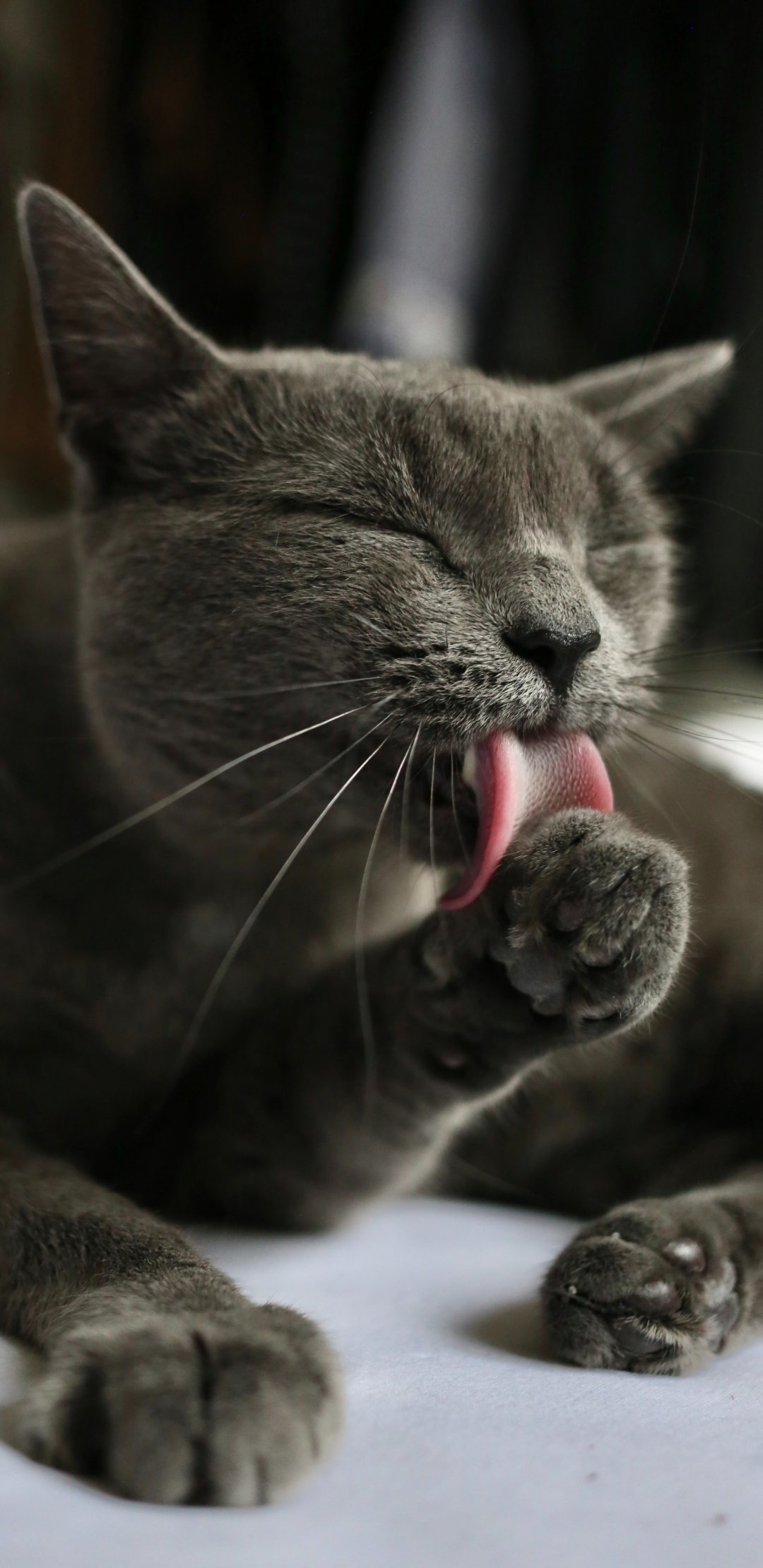 Обои: кошка, вылизывает, серый - 1080x2220