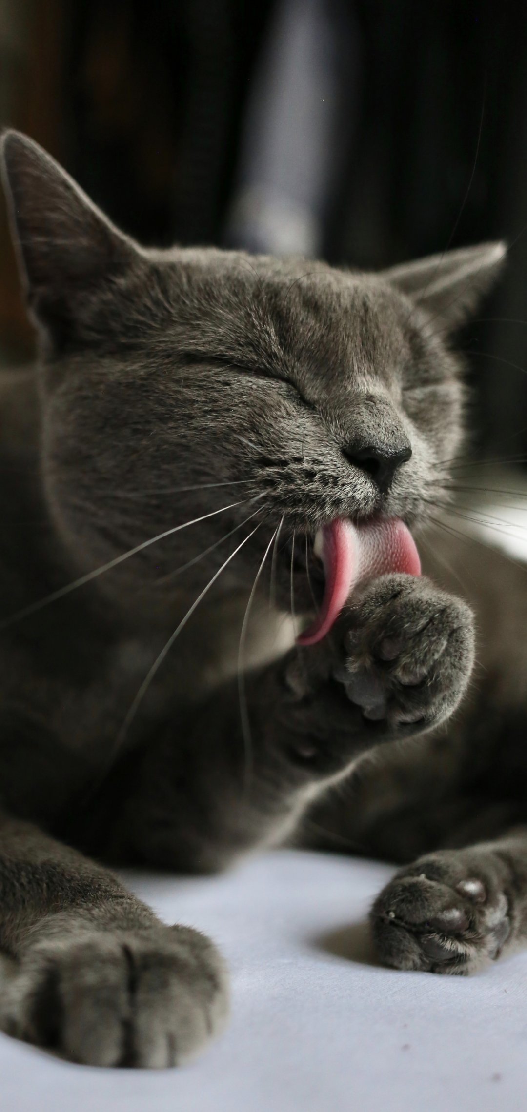 Обои: кошка, вылизывает, серый - 1080x2280