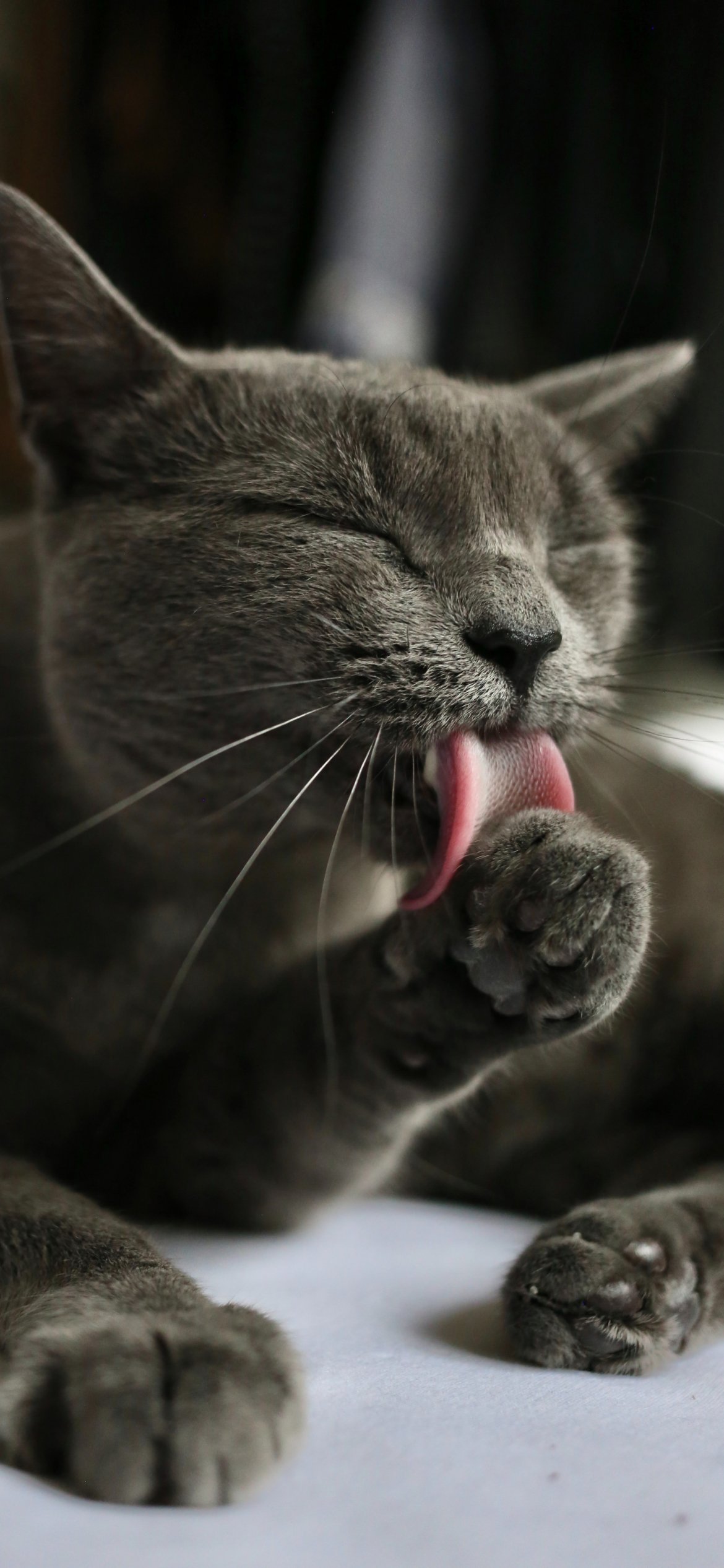 Обои: кошка, вылизывает, серый - 1170x2532