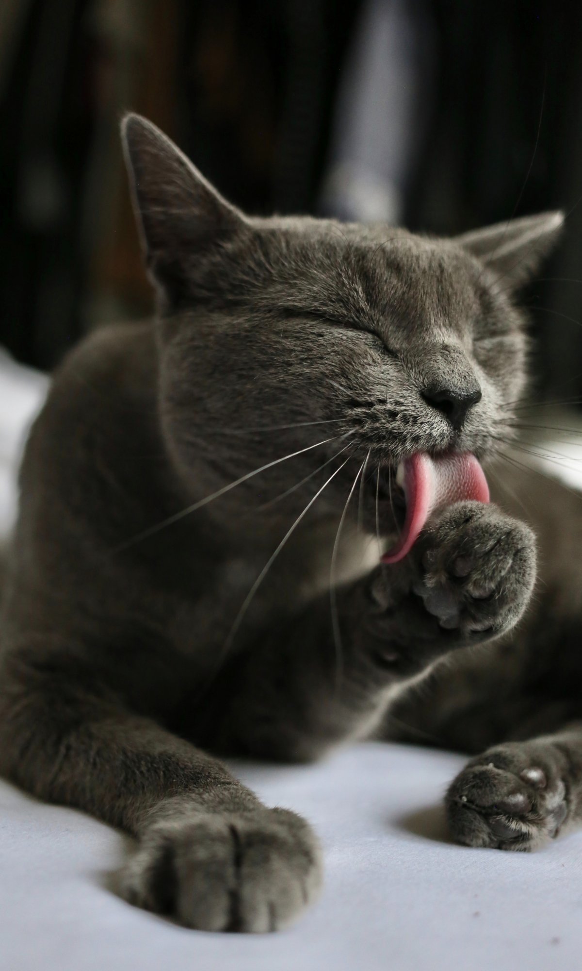 Обои: кошка, вылизывает, серый - 1200x2000