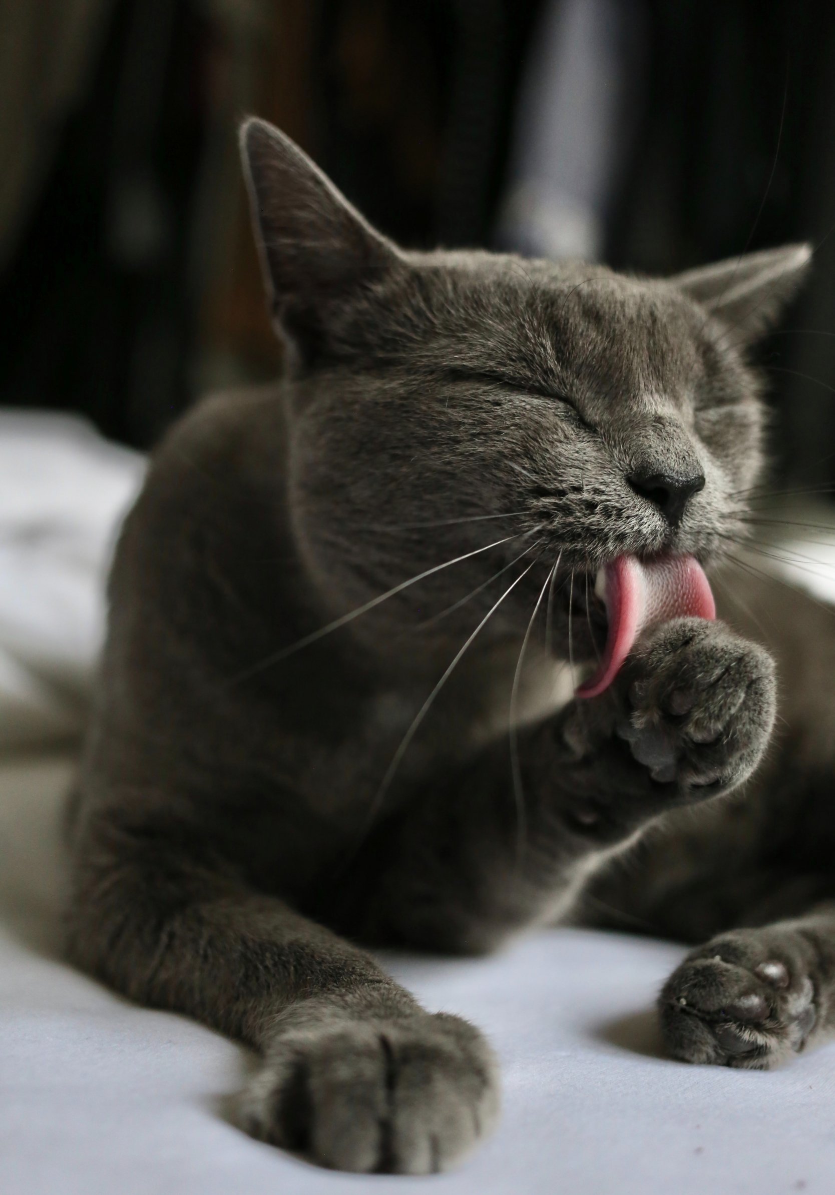 Обои: кошка, вылизывает, серый - 1668x2388