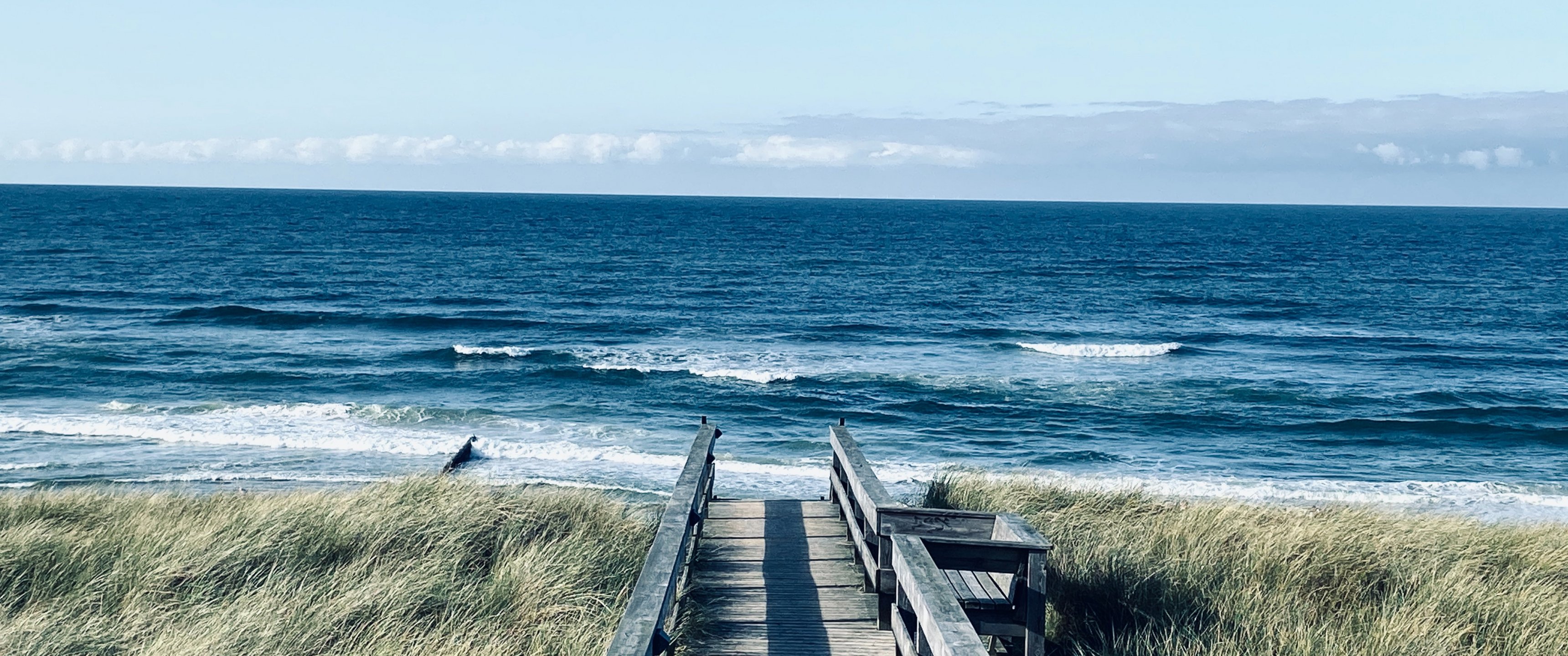 Обои: море, берег, пирс, трава - 3440x1440