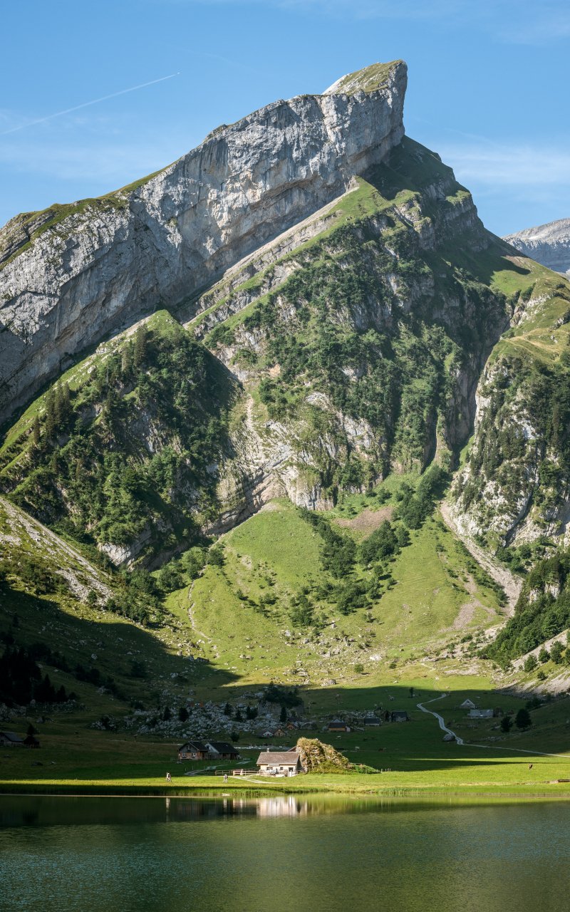 Обои: горы, озеро, дом у озера - 800x1280