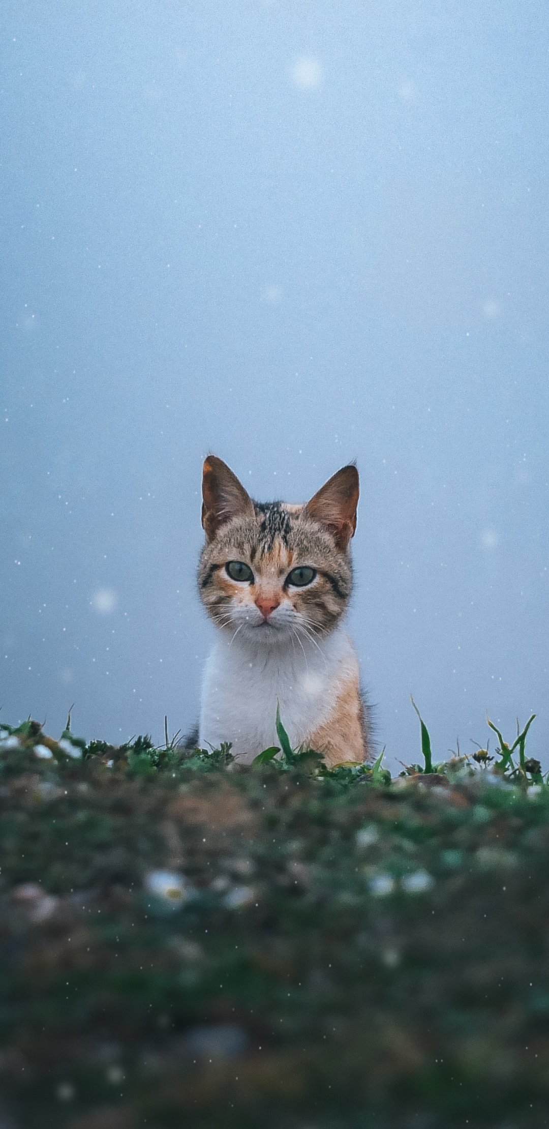 Обои: кошка, снег, трава - 1080x2220