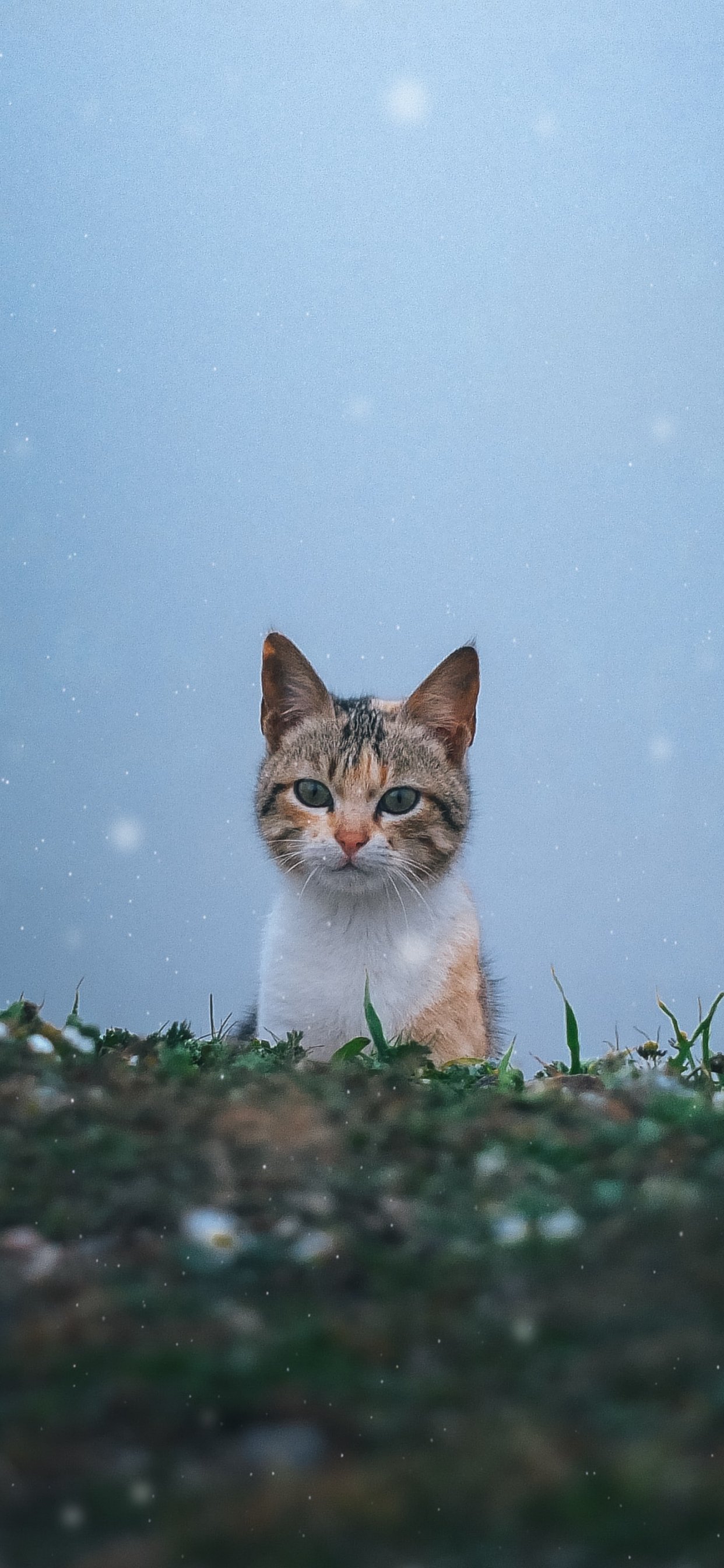 Обои: кошка, снег, трава - 1242x2688