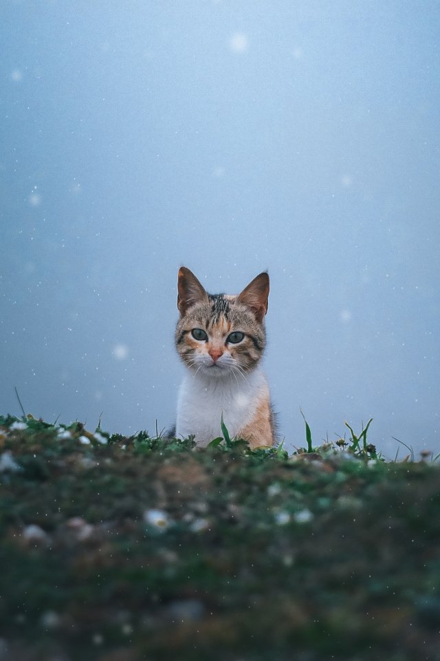 Обои: кошка, снег, трава - 640x960
