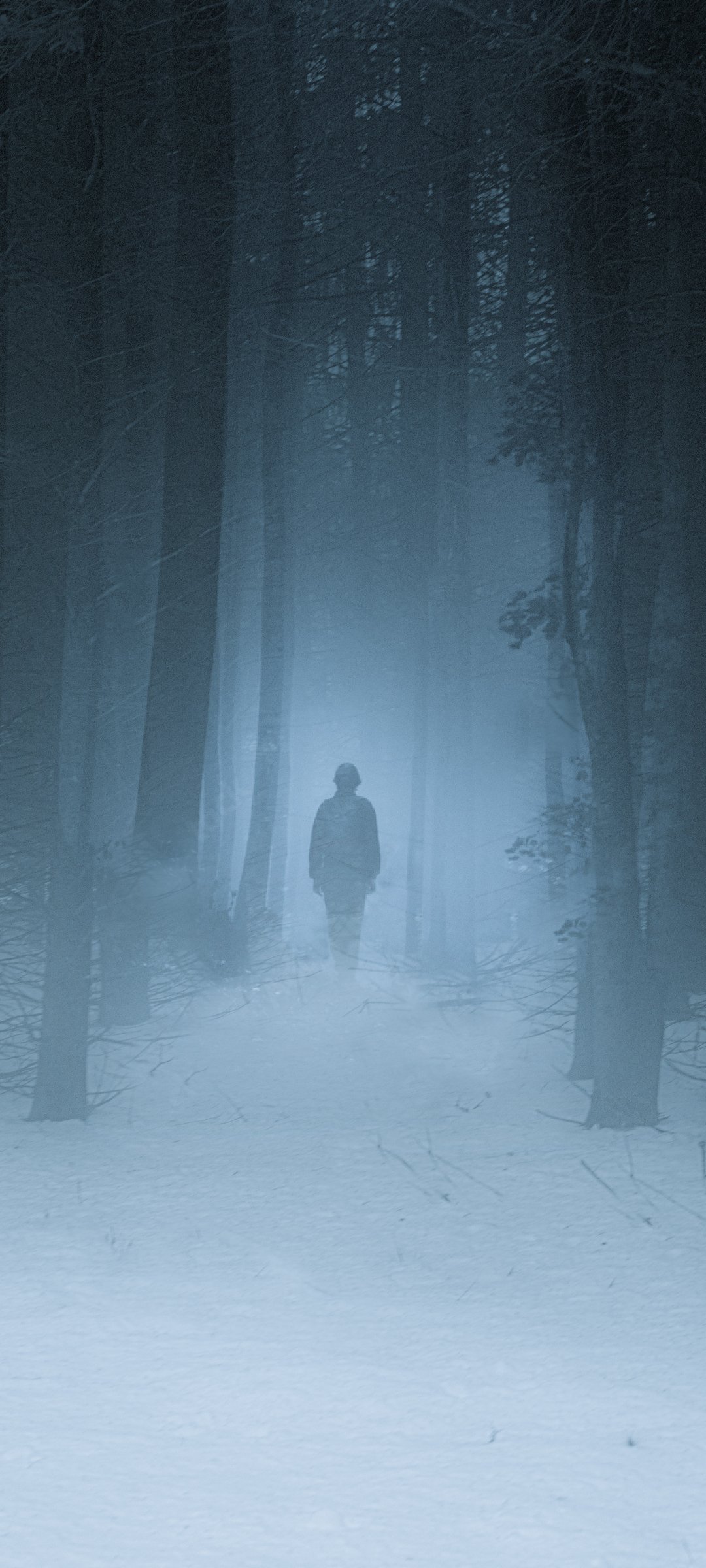 Обои: туманный лес, человек, снег - 1080x2400